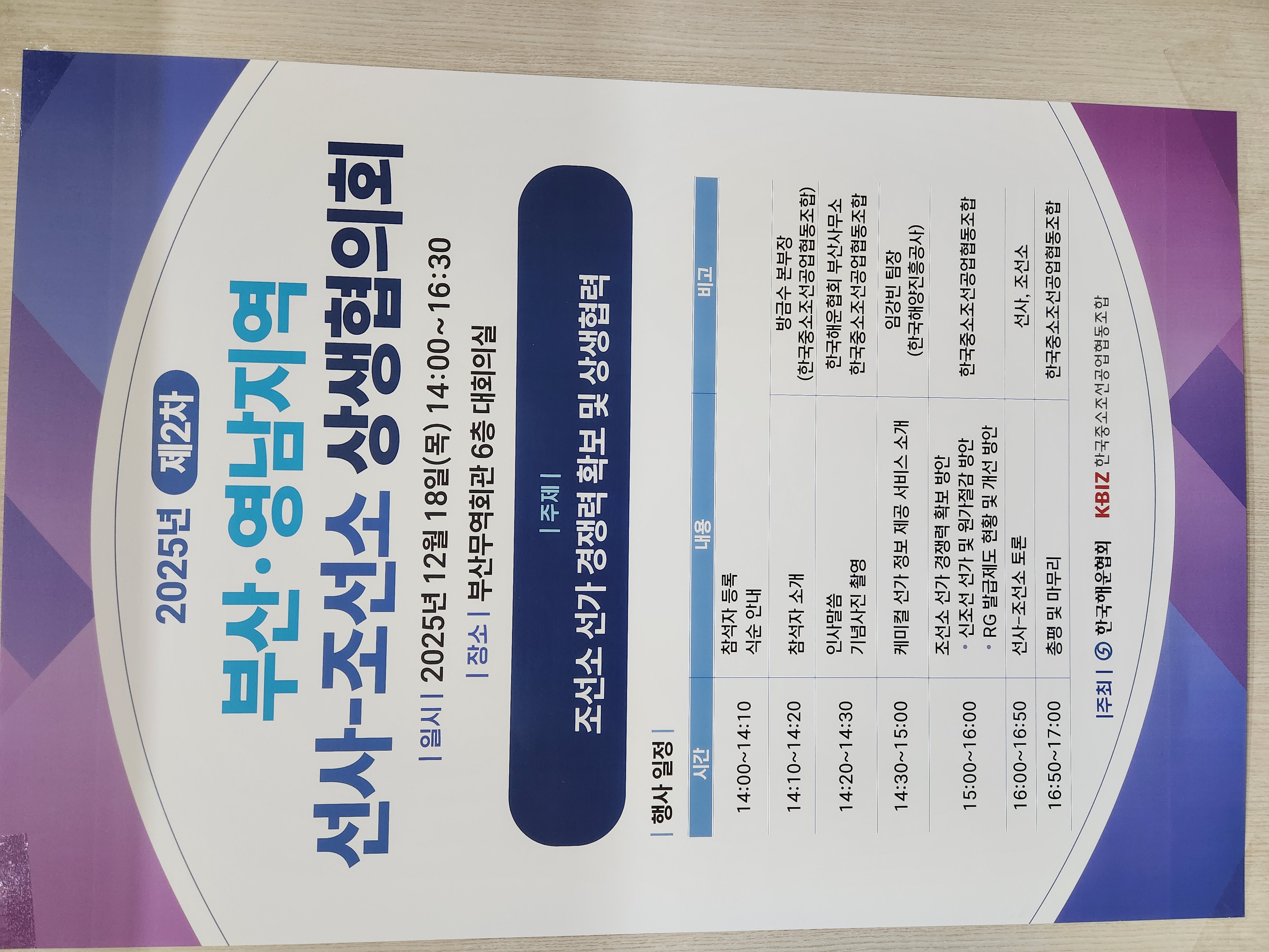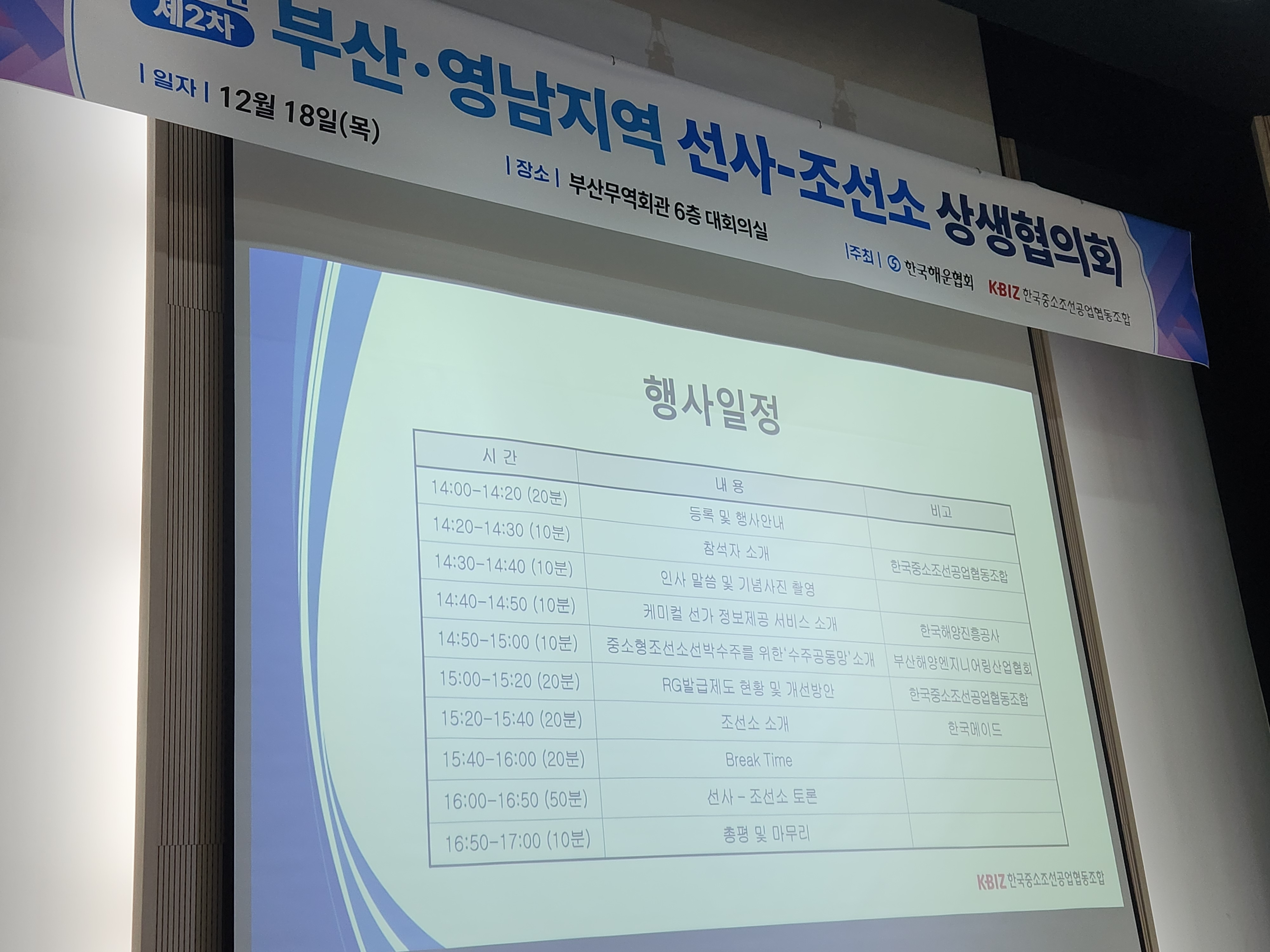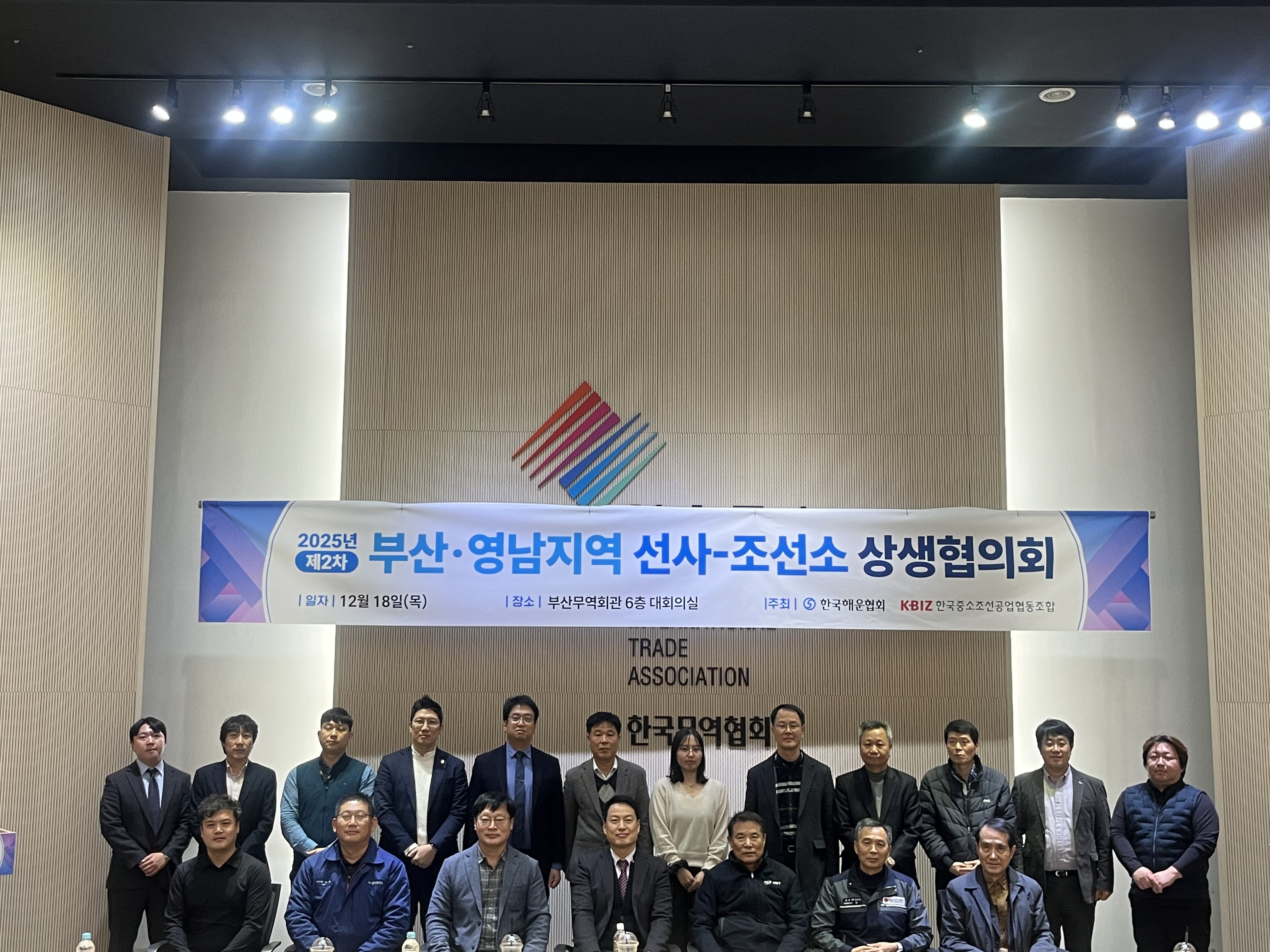 한국중소조선공업협동조합(이사장 김성태)에서는 지난 12월 18일(목) 한국해운협회(회장 박정석) 부산사무소와 공동으로 무역협회 부산지역본부 회의실에서 부산ㆍ영남지역 선사와 조선소간 상생협력을 위한 제2차 협의회를 개최하였다. |